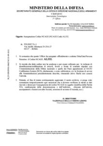 Polinet S.r.l. ha ottenuto, in data 20 settembre 2012, l’assegnazione di NCAGE code AL332, che nel NATO CODIFICATION SYSTEM ci identifica come fornitori contrattuali per le Amministrazioni della Difesa e gli Enti Governativi NATO. Questo codice rappresenta un importante riconoscimento della nostra capacità di soddisfare rigorosi standard internazionali. Vedi i dettagli sul sito NSPA (Nato Support and Procurement Agency). Visualizza il Certificato NCAGE NATO (Codice AL332)